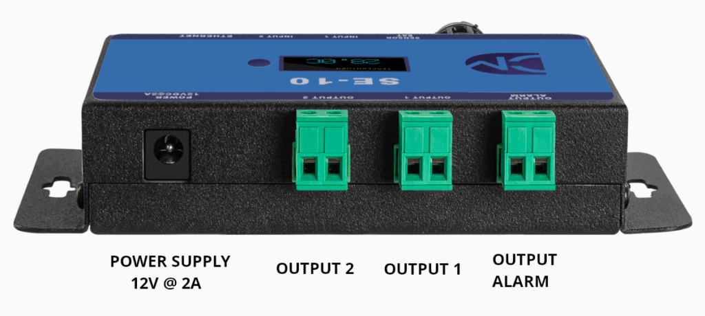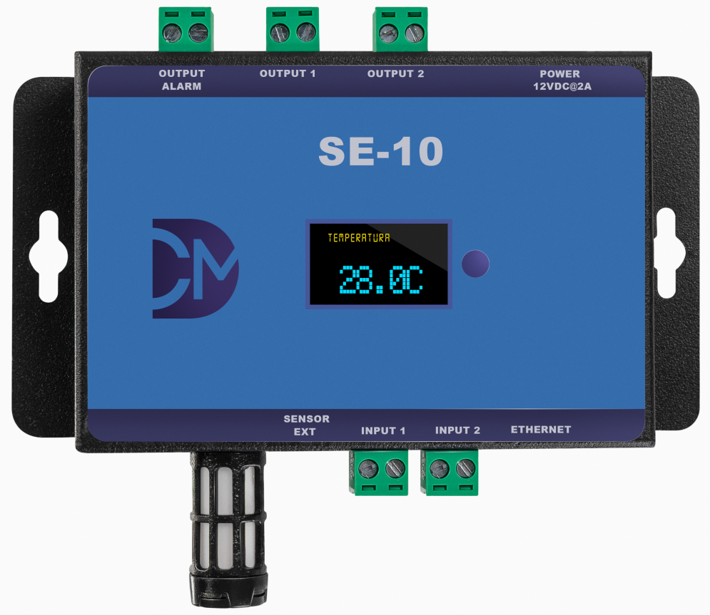 O SE-10 é um monitor ambiental para Datacenters com sensores de temperatura e umidade internos para monitorar o ambiente e sonda de temperatura para monitorar o interior do rack. Conexão Ethernet e saídas que permitem o acionamento de duas cargas externas e um alarme através de contatos (relés).